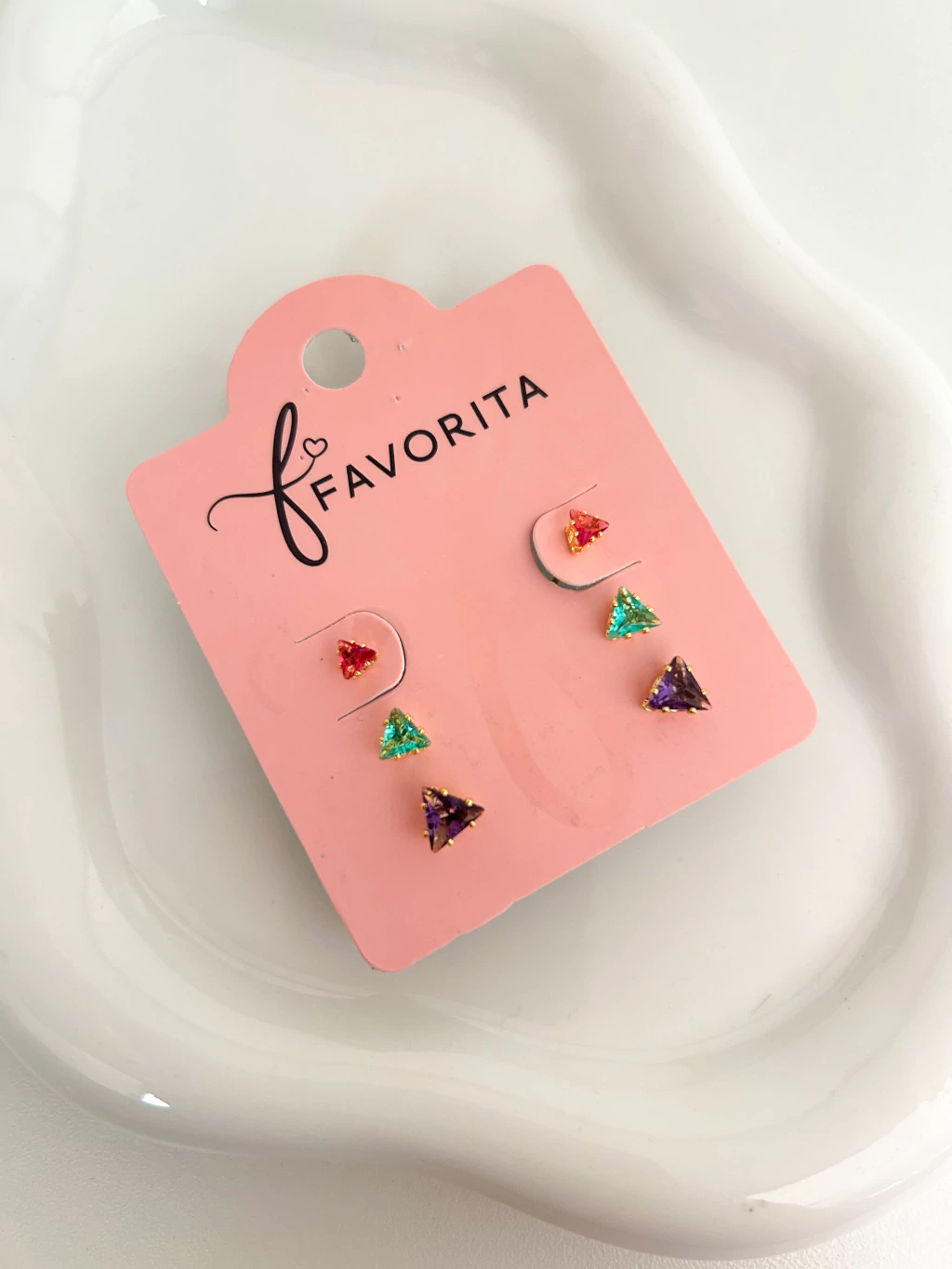 BR92047 - KIT DE BRINCOS TRIÂNGULOS COLORIDOS - FOLHEADO A OURO