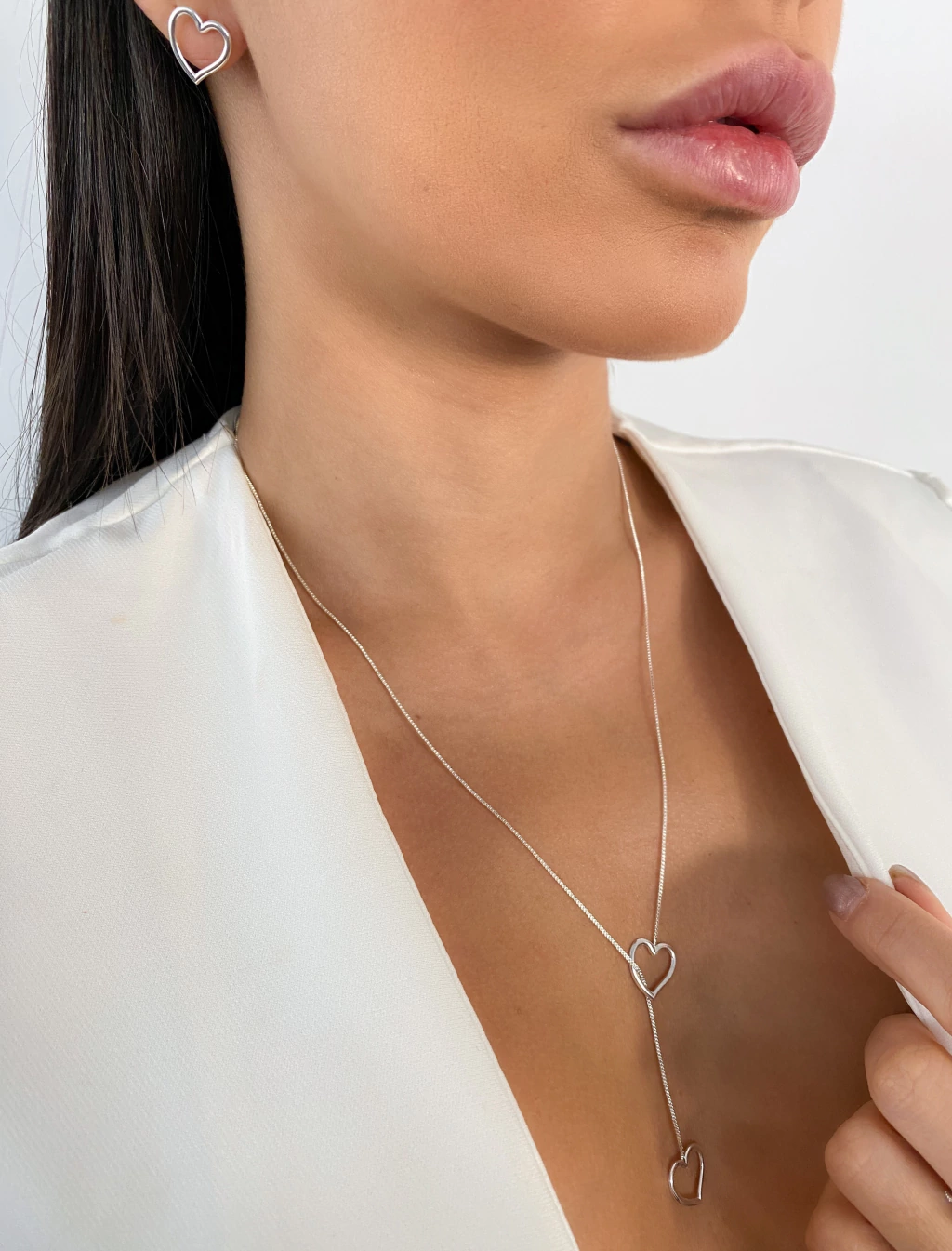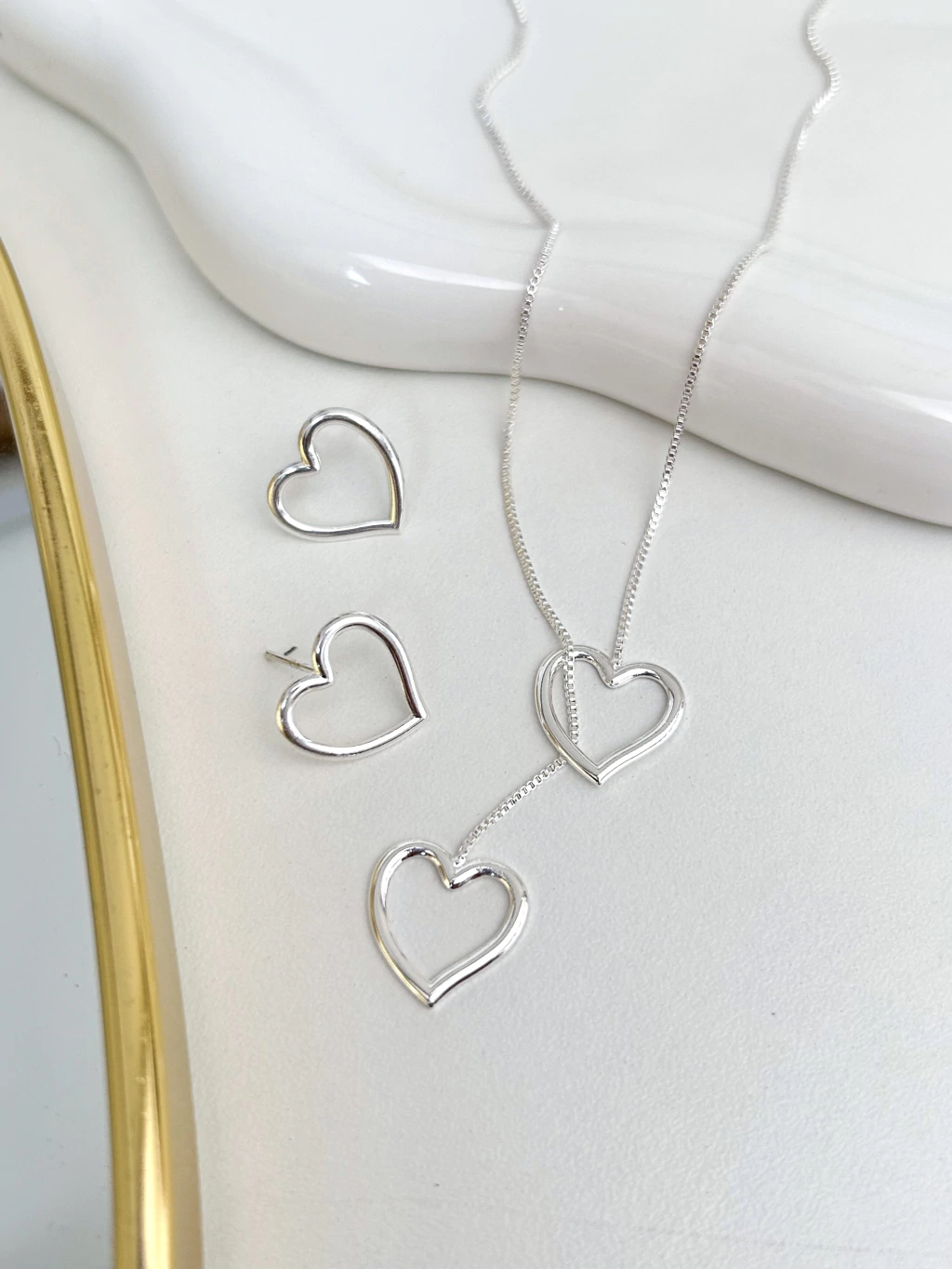 CONJ9406 - CONJUNTO COLAR + BRINCO CORAÇÃO GRAVATINHA - FOLHEADO A PRATA 925