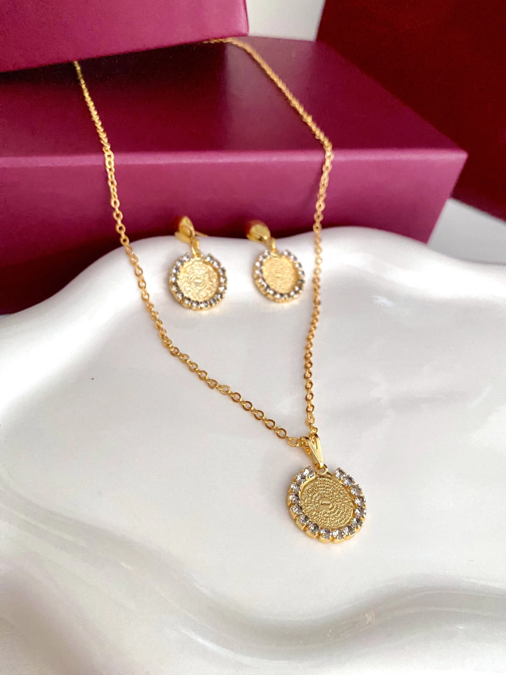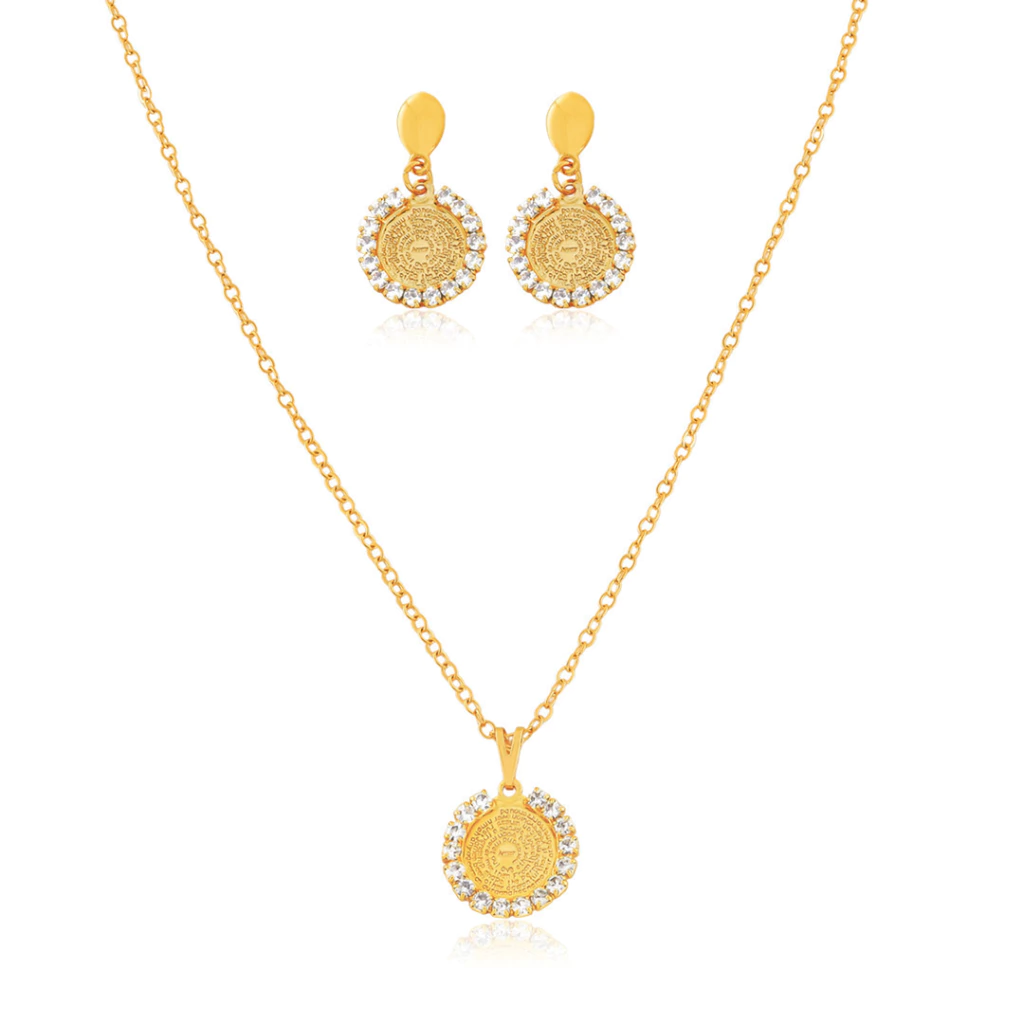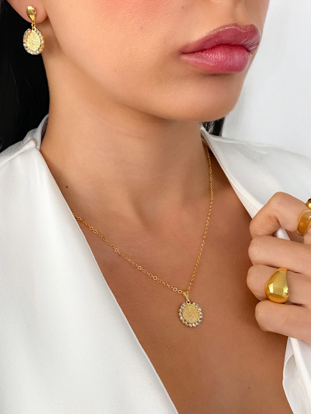 CONJ9433 - CONJUNTO COLAR + BRINCO MEDALHA PAI NOSSO CRAVEJADO - FOLHEADO A OURO