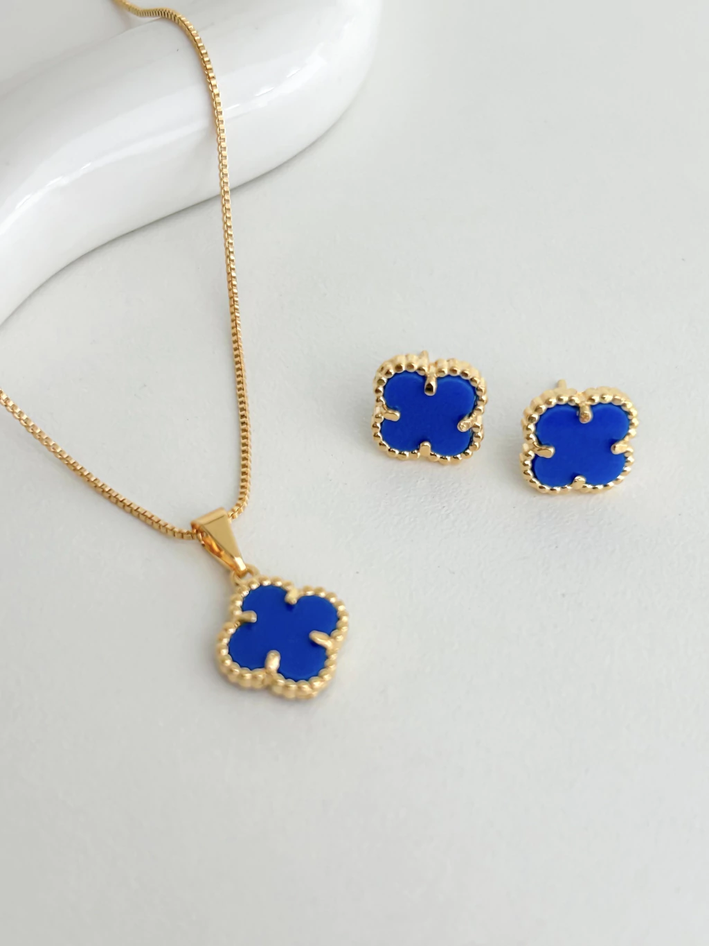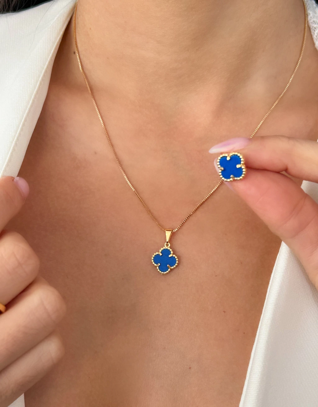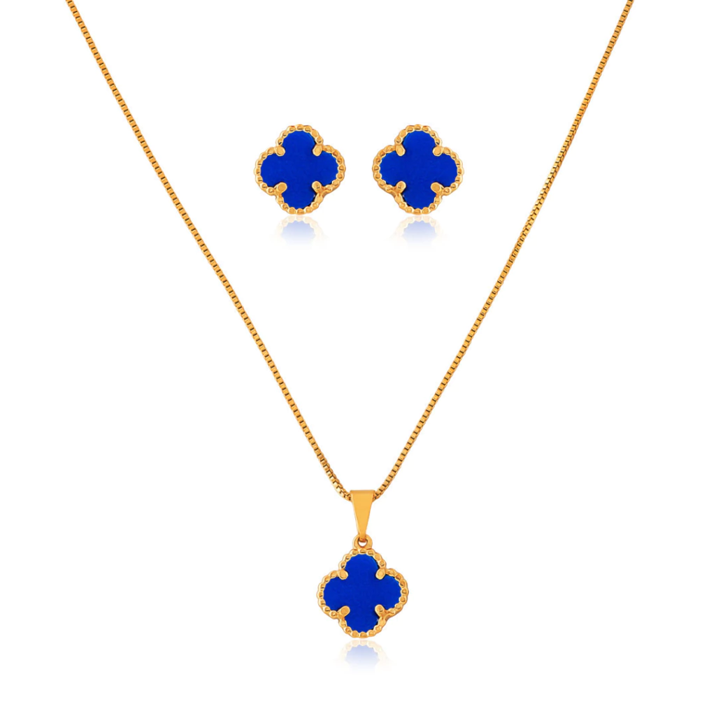 CONJ9455 - CONJUNTO COLAR + BRINCO INSPIRAÇÃO VG AZUL - FOLHEADO A OURO