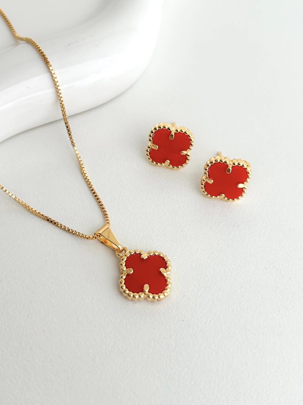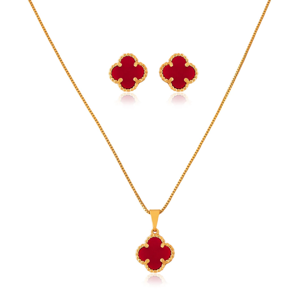 CONJ9457 - CONJUNTO COLAR + BRINCO INSPIRAÇÃO VG VERMELHO - FOLHEADO A OURO