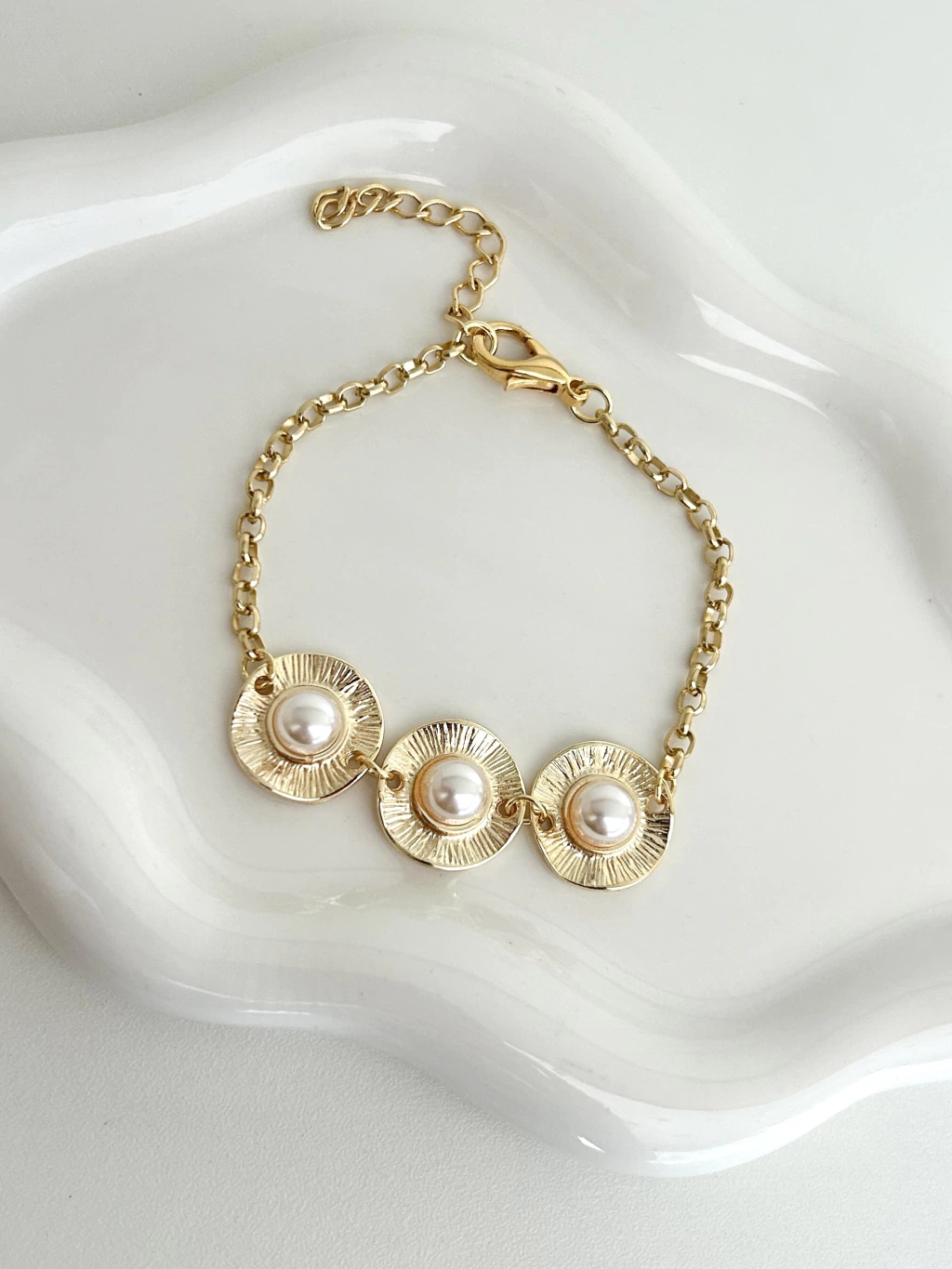 PU91262 - PULSEIRA ELO PORTUGUÊS MEDALHINHAS COM PÉROLAS - FOLHEADO A OURO