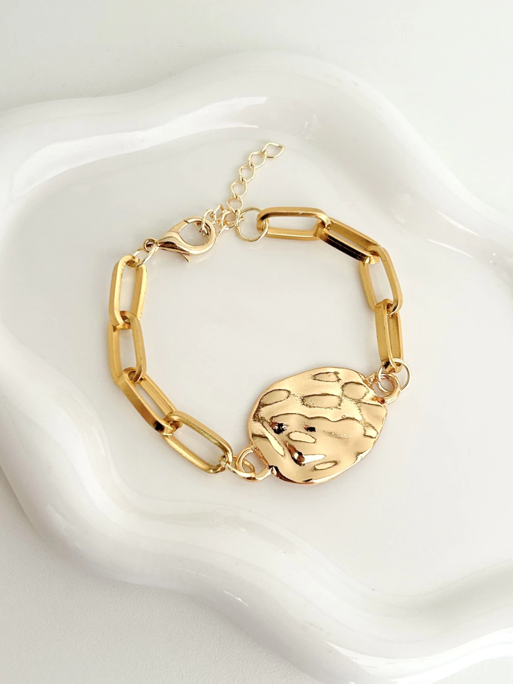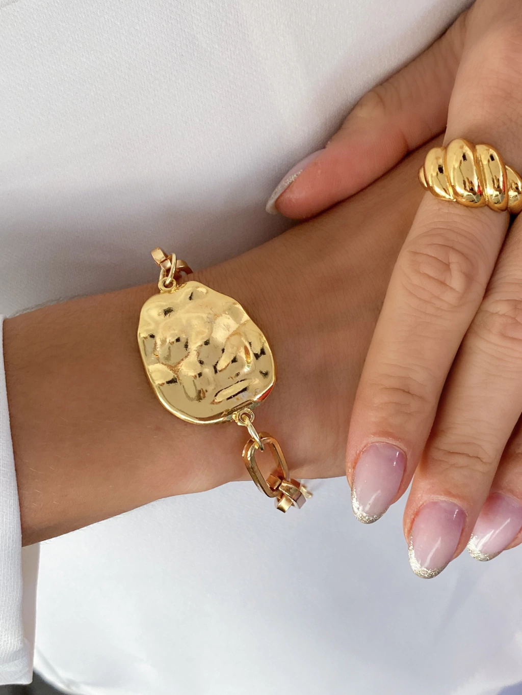 PU91300 - PULSEIRA ELO CADEADO MEDALHA MARTELADA - FOLHEADO A OURO